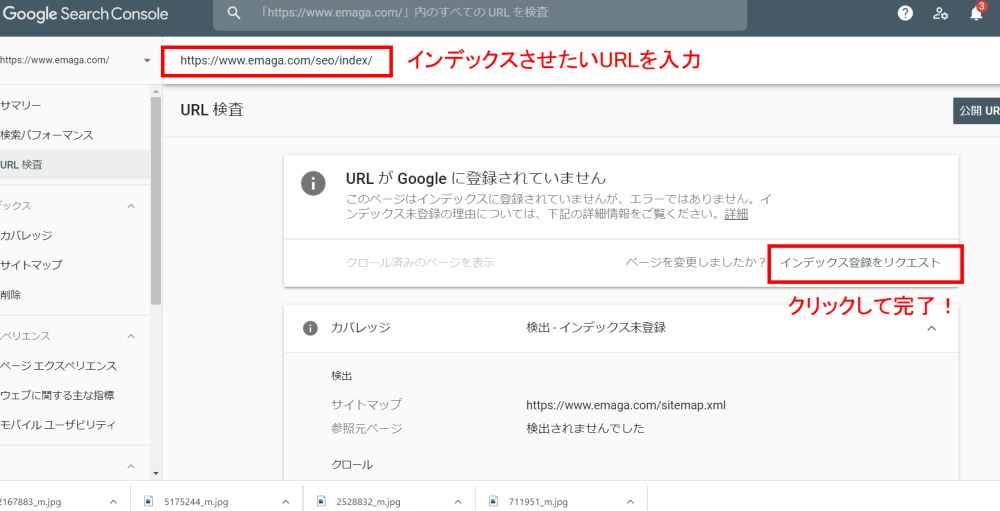 このなかにあるURLの検査を使って、インデックスの登録のリクエストを行っていきます。